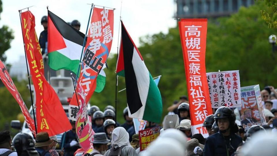 Hiroşima'da düzenlenen anma törenine katılan vatandaşlar, Filistin'e destek gösterisinde de bulundu.