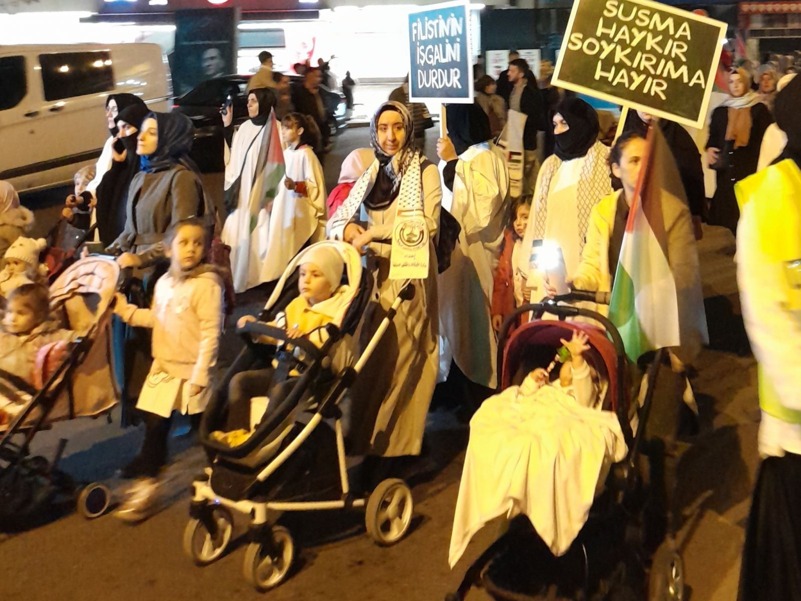 Kocatepe Camii'nde bir araya gelen katılımcılar, çocuklarını bebek arabalarıyla getirerek oluşturdukları kortejle İsrail'in Filistin'e yönelik saldırılarına karşı birlikte yürüdü. Tekbirlerin getirildiği yürüyüş boyunca, İsrail aleyhinde sloganlar atılarak, Filistin'e destek mesajları verildi.