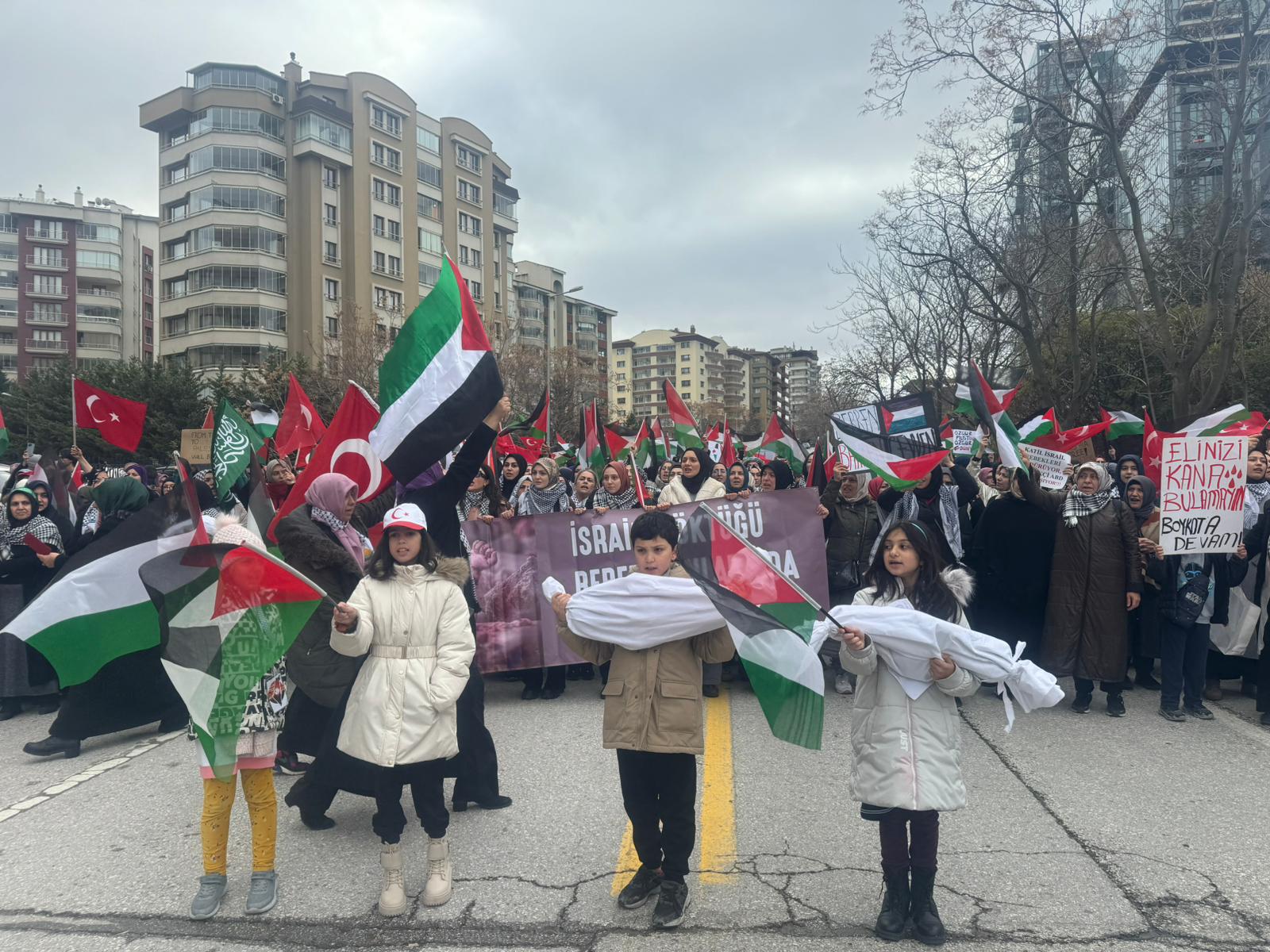 Eyleme katılan kalabalık, kortej eşliğinde Amerikan Büyükelçiliği önüne yürürken AB ve İsrail aleyhine sloganlar attı. Protestocular, kanlı bebek maketleri ve görsellerle donatarak İnsan Haklarına dikkat çektiler.