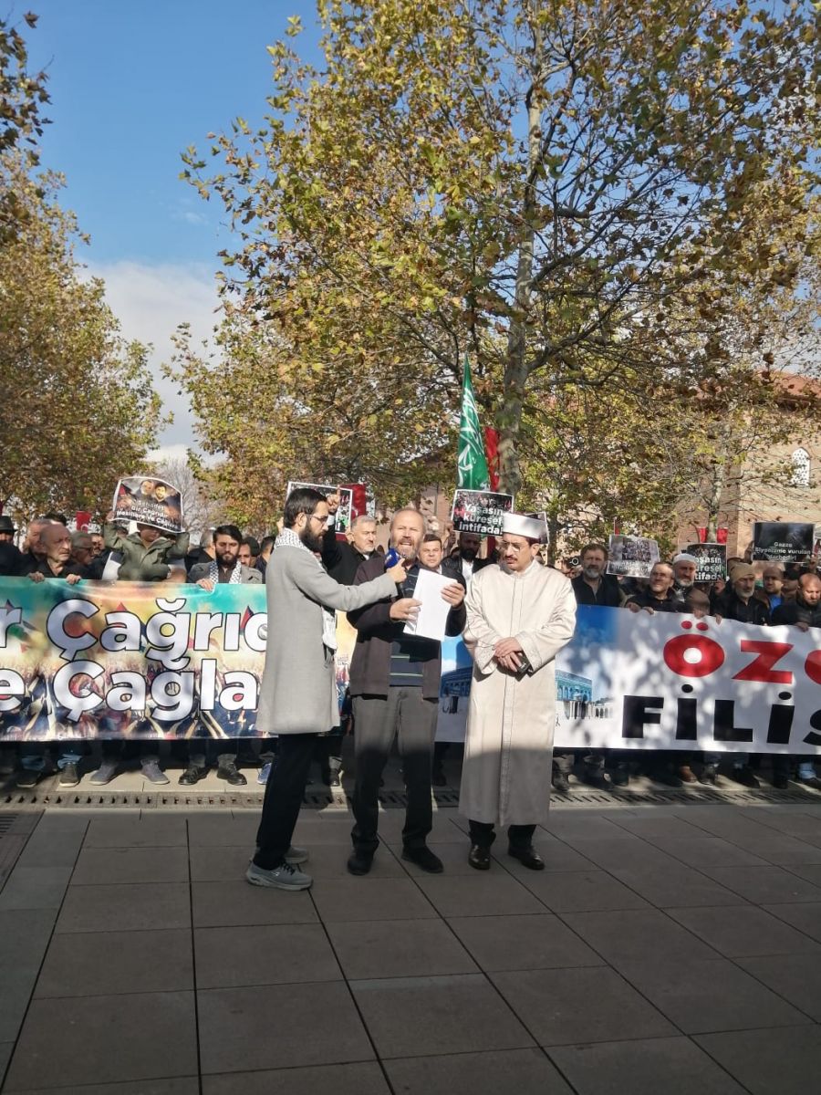 Ankara Filistin Dayanışma Platformu üyeleri, Hacı Bayram Veli Camii avlusunda bir araya gelerek Filistin'de yaşanan olaylara dikkat çekmek amacıyla basın açıklaması düzenledi. Basın açıklamasını İMH Ankara Yönetim Kurulu Üyesi Harun Özçelik okudu.