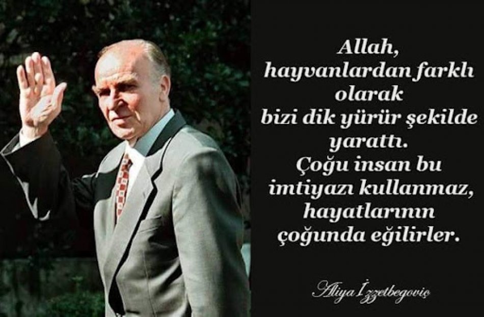 "Doğu Batı Arasında İslam", "İslam Deklarasyonu", "İslami Yeniden Doğuşun Sorunları", "Özgürlüğe Kaçışım", "Tarihe Tanıklığım" gibi eserleriyle Türkiye'de de büyük bir okur kitlesi bulunan Aliya İzzetbegoviç'in sözleri şöyle: