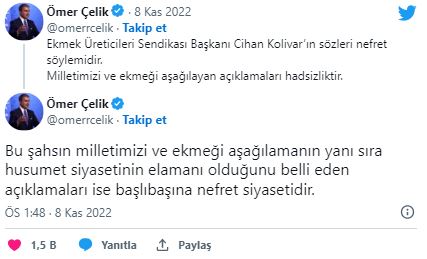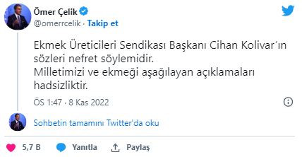 Çelik paylaşımında; “Ekmek Üreticileri Sendikası Başkanı Cihan Kolivar’ın sözleri nefret söylemidir. Milletimizi ve ekmeği aşağılayan açıklamaları hadsizliktir. Bu şahsın milletimizi ve ekmeği aşağılamanın yanı sıra husumet siyasetinin elamanı olduğunu belli eden açıklamaları ise başlıbaşına nefret siyasetidir” dedi.