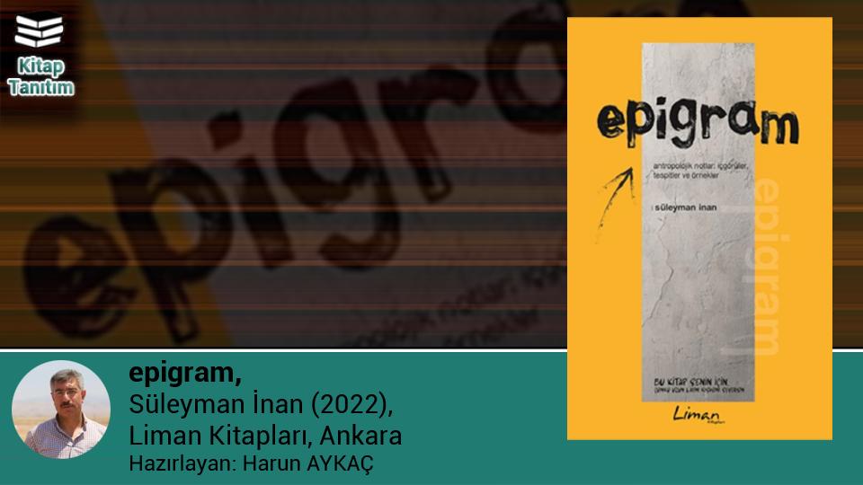 Epigram, Süleyman İnan’ın çeşitli bilim alanlarındaki kitaplarından sonra yaşadıkları ve birikimlerinden çıkan tür dışı bir kitap. Edebiyat ve felsefeye ilgi duyanların zevk alarak okuyabilecekleri bir eser.