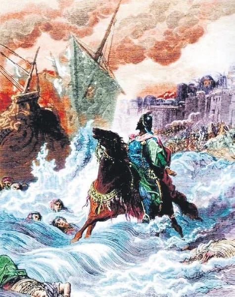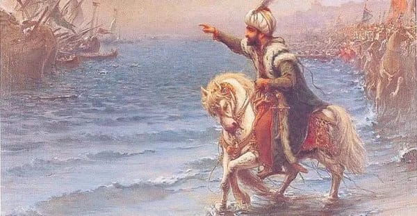 Fatih atını denize sürüyor.