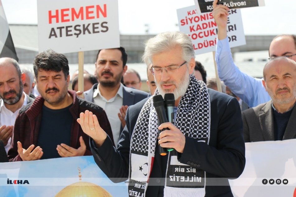 Kassam Tugayları Genel Komutanı Muhammed Deif’in; “Sınırların, rejimlerin ve kısıtlamaların sizi Mescid-i Aksa'nın kurtarılması cihadına katılma şerefinden mahrum etmesine izin vermeyin.'' mesajına Ankara’dan destek vermek için buradayız.