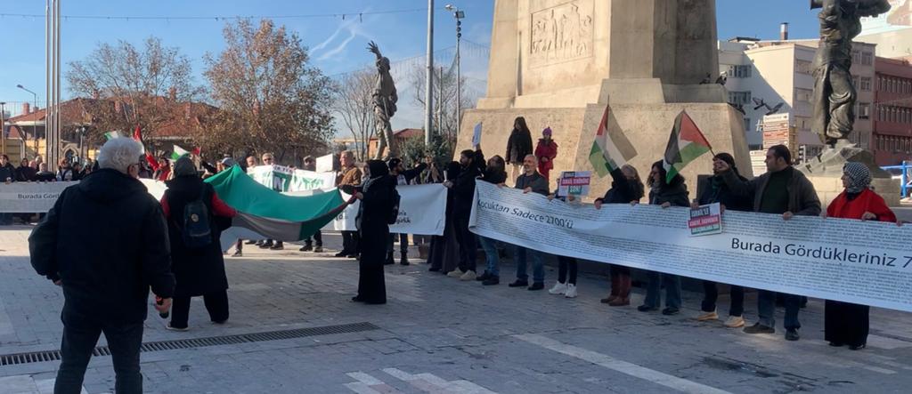 Gazze için, Filistin için, Gazze’de acil ateşkes talebimizi bir kez daha haykırmak için buradayız. Dile kolay, tam 83 gündür Gazze, Filistin halkı yakılıp yıkılıyor, öldürülüyor. 83 günde 30 bine yakın insan, 11 bini aşkın çocuk ve 6 bine yakın kadın katledildi. Öldürülenlerin yüzde 90’ı sivil. Dünyanın gözü önünde bir halk yok ediliyor, bir soykırım yaşanıyor. Hala ateşkes yok, durmuyor. Her 10-15 dakikada bir çocuk öldürülüyor. 226 sağlık çalışanı katledildi. Gazze’de yaşananları aktarmaya çalışan basın mensupları hedef alındı, 101 gazeteci öldürüldü. 135 sağlık merkezi hedef alındı. 165 basın merkezi enkaza döndü. Bu aktardıklarımızın hiçbirisi basitçe bir sayı değil. 2,5 milyonluk nüfusun 2 milyona yakını yerinden, evinden edildi. Sağlık merkezlerinin yarısından fazlası yok edildi. Camiler, kiliseler, su sanitasyon merkezleri yok ediliyor. Apaçık bir halk, bir şehir yok ediliyor gözlerimizin önünde.