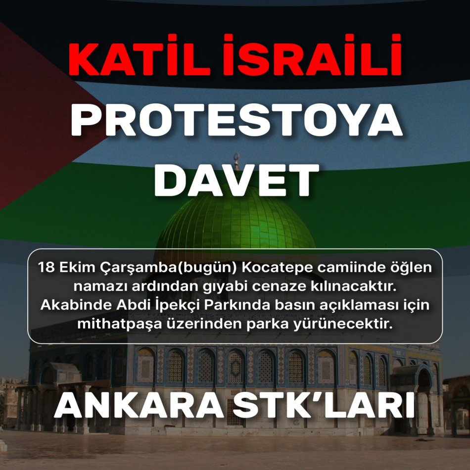 Ankara'daki STK'lar Katil İsrail'in Gazzedeki hastane saldırısını protesto etmek için Kocatepe Camiinde Gıyabi Cenaze Namazı kılacak. Daha sonra ise Kocatepeden Sıhhiye Abdi İpekçi Parkına kadar yürüyüş düzenleyip basın açıklaması yapacaklar.