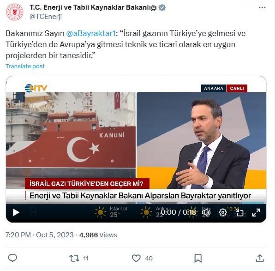 "Bakanımız Sayın @aBayraktar1: 'İsrail gazının Türkiye’ye gelmesi ve Türkiye’den de Avrupa’ya gitmesi teknik ve ticari olarak en uygun projelerden bir tanesidir.'"