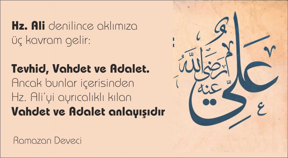 Hz. Ali’nin vahdet ve adalet hassasiyetinin Müslümanlarca yeterince bilindiği ve anlaşıldığı kanaatinde değilim. İlahi emir olan İslam’ın iki önemli değeri vahdet ve adalet anlayışının doğru anlaşılması için Hz. Ali’nin örnekliğine ihtiyacımız olduğunu düşünüyorum.