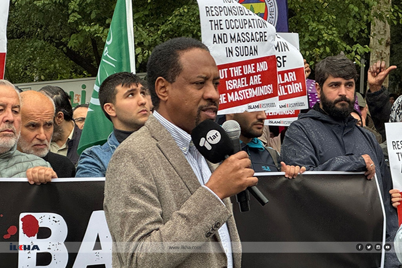 BAE'nin sahip olduğu finans gücüyle bütün İslam coğrafyasında büyük zulümler icra ettiğini söyleyen Kaya, "Bu ülkenin Mısır'da Sisi'yi, Libya'da Hafter'i, Tunus'ta İslami harekete düşmanlık eden Kays Said'i destekliyor. Güney Yemen'in Yemen'den kopması için uğraştı. 15 Temmuz darbecileriyle işbirliği yaptı. Gazze'de Siyonist çeteye dolaylı anlaşmalarla arka çıktı. Müslümanlar BAE'yi lanetliyor. BAE, işlediği suçlarla tarihe geçiyor. Aynen Gazze halkıyla olduğu gibi Sudan halkıyla da dayanışma içerisindeyiz. İslami dayanışmamızı buradan ilan ediyoruz. Sudan halkı yalnız değildir." diye konuştu.