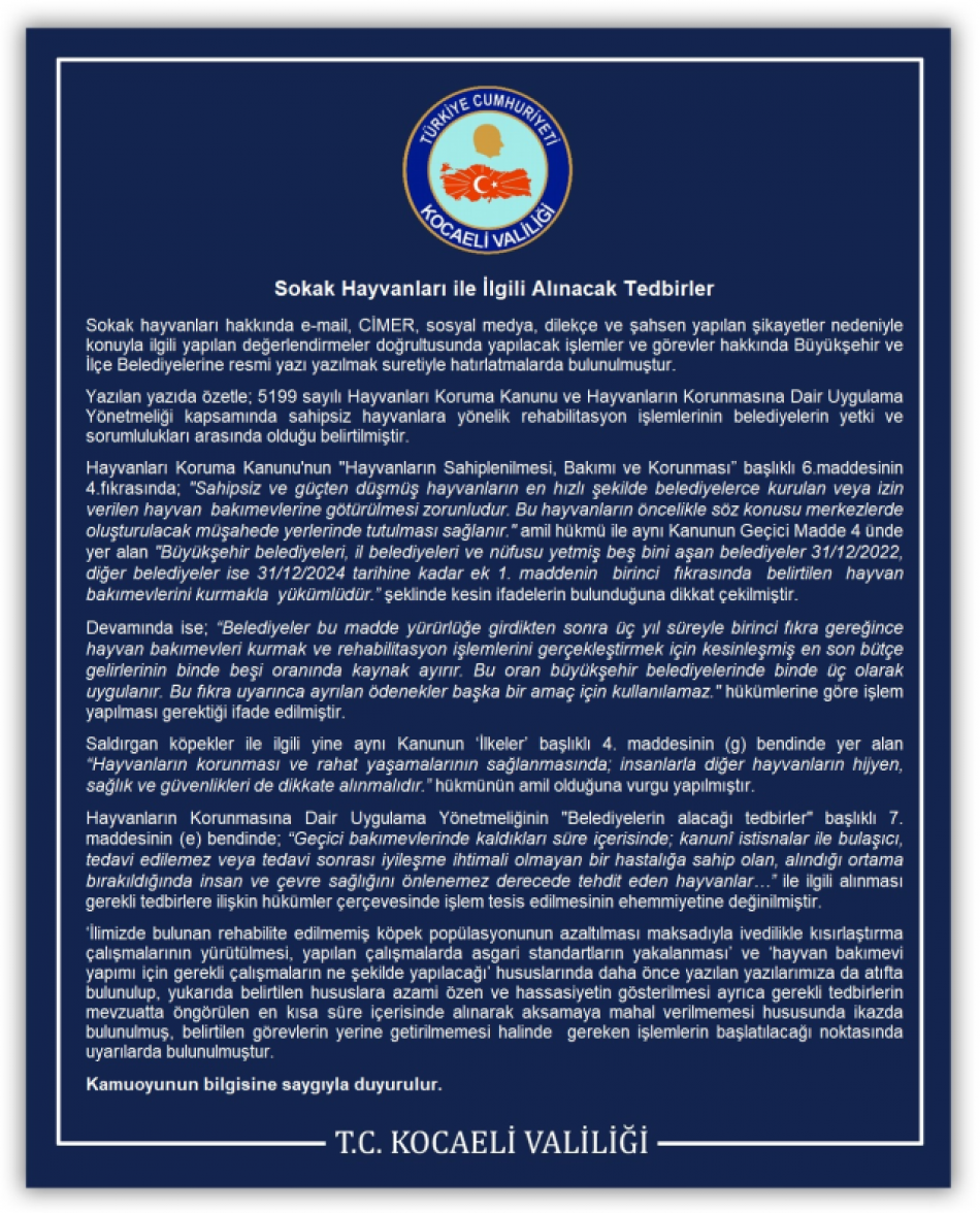 Kocaeli Valiliği, günlerdir ülke gündemini meşgul eden sokak hayvanlarıyla ilgili alınacak tedbirleri duyurdu. Yapılan duyuruda belediyelerin sorumluluklarının altı çizilirken, iyileşme veya çevreye zararını önleme umudu olmayan köpeklerin en az acı veren ve en hızlı şekilde ölümünü sağlayan yöntemlerle öldürülmesi ile ilgili çalışma başlatılması talimatını verdi.