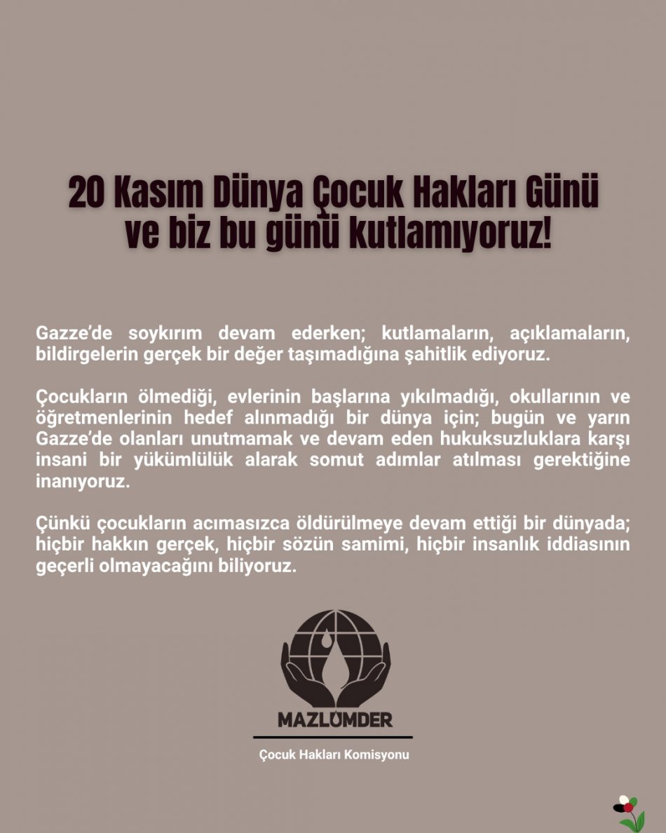 İnsan Hakları ve Mazlumlar için Dayanışma Derneği (MAZLUMDER), 20 Kasım Dünya Çocuk Hakları günü nedeniyle bir açıklama yaptı.