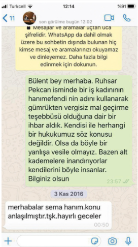 “Bülent bey merhaba. Ruhsar Pekcan isminde bir iş kadınının hanımefendinin (Emine Erdoğan'ı kastediyor) adını kullanarak, gümrükten vergisiz mal geçirme teşebbüsü olduğuna dair bir ihbar aldık. Kendisiyle herhangi bir hukukumuz söz konusu değildir. Olsa da böyle bir yanlışa vesile olmayız. Bazen alt kademelere inandırıyorlar kendilerini böyle insanlar. Bilginiz olsun.”