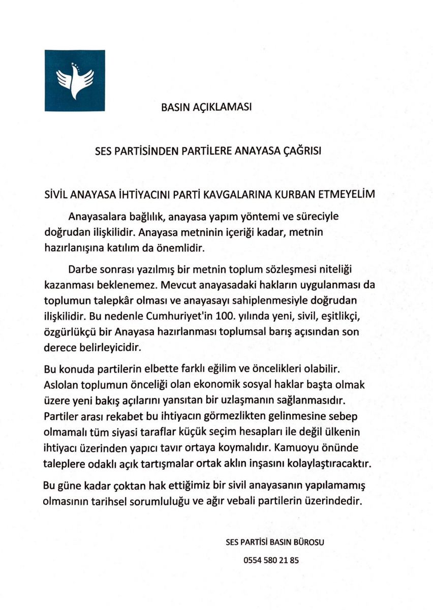Sivil anayasa hazırlığı, ülkenin demokratikleşme ve toplumsal barış yolunda önemli bir adım olarak görülüyor. SES Partisi, tüm siyasi tarafları, ülkenin ihtiyaçlarına odaklanmaya ve yapıcı bir tavır sergilemeye çağırdı. Partilerin, küçük seçim hesapları yerine Türkiye'nin geleceği için bir araya gelmeleri gerektiğini vurguladı.