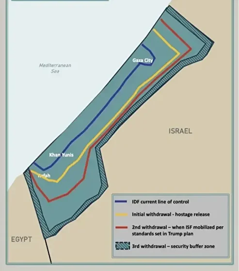 Mavi çizgi – İsrail ordusunun mevcut kontrol hattı. Sarı çizgi – İlk geri çekilme, rehine takası. Kırmızı çizgi – İkinci geri çekilme, Trump planında belirlenen standartlara göre ISF konuşlandırıldığında. Taramalı alan – Üçüncü geri çekilme, tampon bölge.