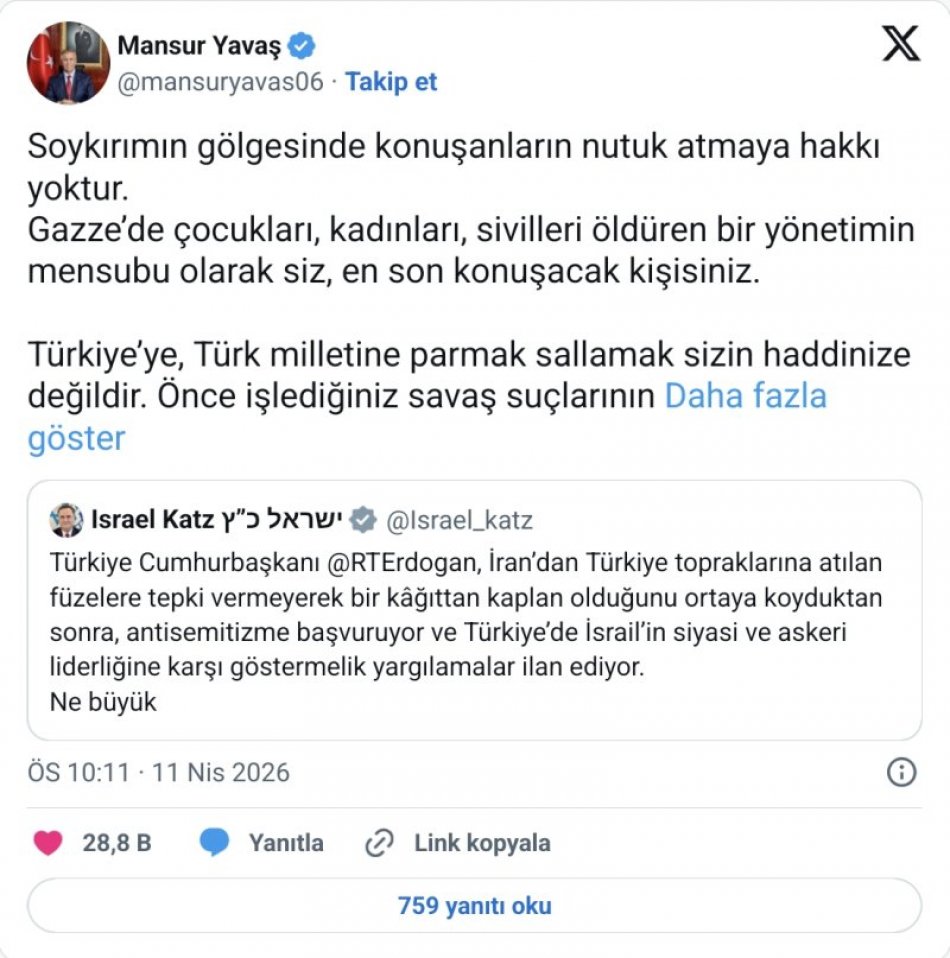 Ankara Büyükşehir Belediye Başkanı (ABB) Mansur Yavaş, sosyal medya üzerinden yaptığı paylaşımla Cumhurbaşkanı Recep Tayyip Erdoğan'ı hedef alan İsrail Savunma Bakanı Israel Katz'a yanıt verdi.