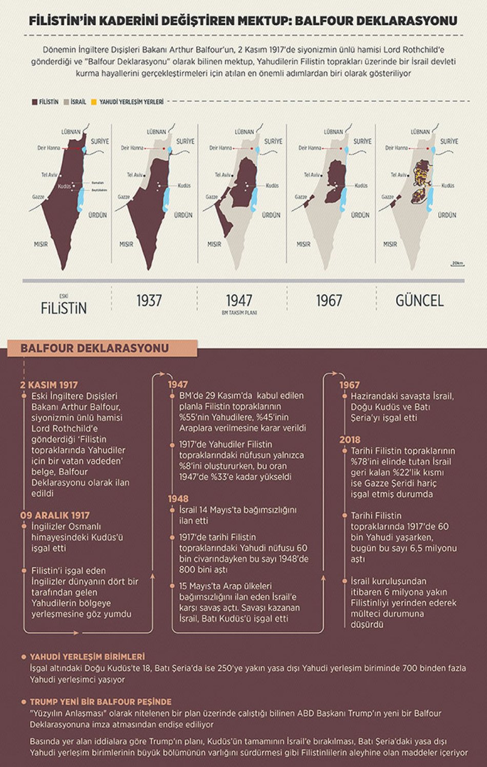 Dönemin emperyal ülkesi İngiltere’nin Dışişleri Bakanı Arthur Balfour, Siyonizm’in ünlü hamisi Lord Rothschild’e 2 Kasım 1917’de gönderdiği mektupta şu ifadelere yer vermişti: