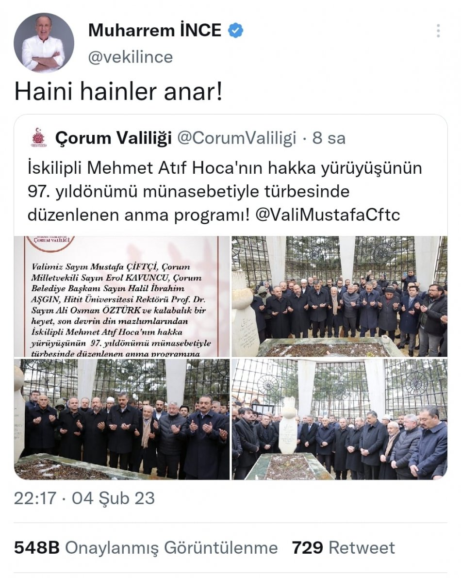İskilipli Atıf Hoca'nın şehâdetinin 97. yılında mezarı başında anan Çorum Valisi Mustafa Çiftçi'yi Ümit Özdağ idamla tehdit etti.