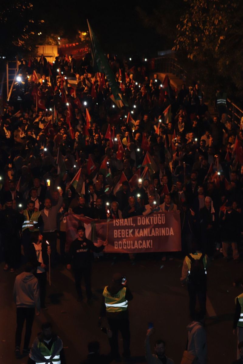Kocatepe Camii'nde bir araya gelen katılımcılar, çocuklarını bebek arabalarıyla getirerek oluşturdukları kortejle İsrail'in Filistin'e yönelik saldırılarına karşı birlikte yürüdü. Tekbirlerin getirildiği yürüyüş boyunca, İsrail aleyhinde sloganlar atılarak, Filistin'e destek mesajları verildi.