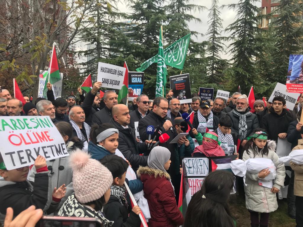 Eyleme katılan kalabalık, kortej eşliğinde Amerikan Büyükelçiliği önüne yürürken AB ve İsrail aleyhine sloganlar attı. Protestocular, kanlı bebek maketleri ve görsellerle donatarak İnsan Haklarına dikkat çektiler.