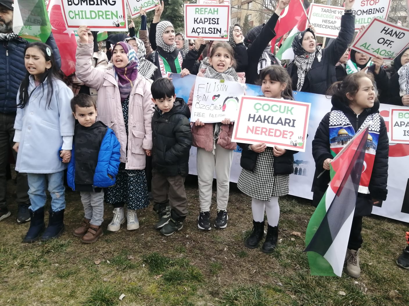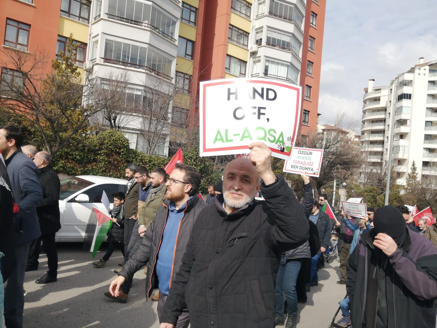 Ankara Filistin Dayanışma Platformu'nun öncülüğünde, başkentin Çankaya ilçesinde bulunan Tuğba Altınok Camii'nde toplanan Ankaralılar, ABD Büyükelçiliği önüne doğru yürüyüş gerçekleştirdi. Yürüyüş sırasında tekbirler ve sloganlar atılırken, bazı vatandaşlar gözyaşlarına boğuldu.