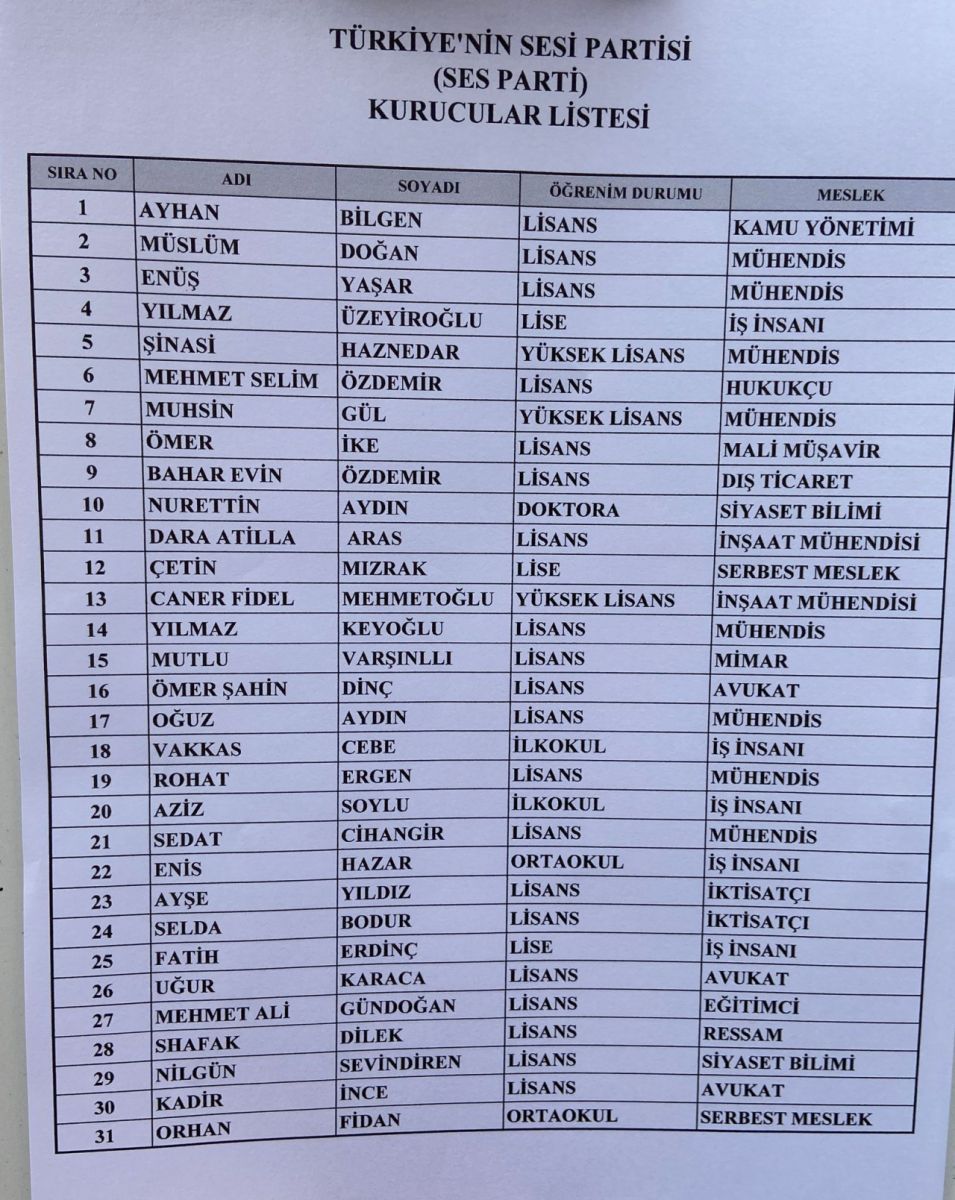 Kısaltması ‘SES’ olan partinin kurucu başkanı Ayhan Bilgen olurken, bakanlığa 31 kurucu üye ile başvuru yapıldı.