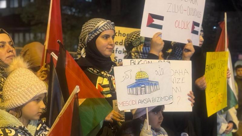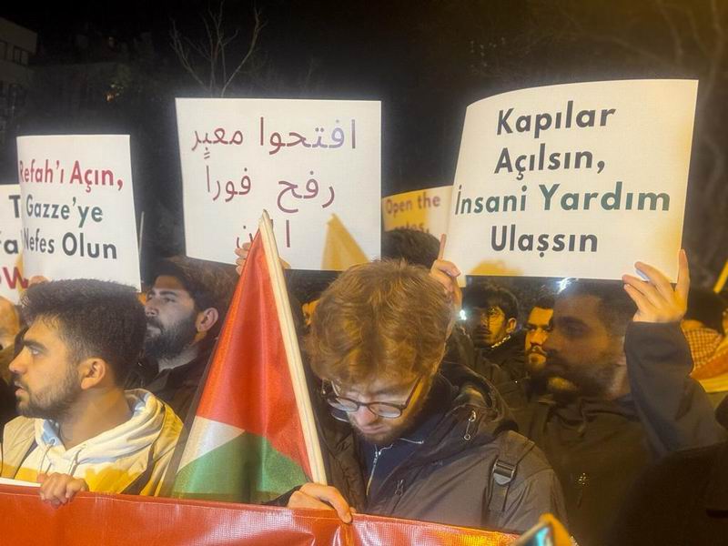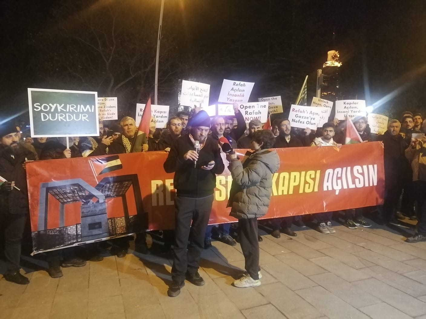 Ankara Filistin Dayanışma Platformunun çağrısıyla Mısır Büyükelçiliği önünde toplanan birçok sivil toplum kuruluşu mensubu “Refah Sınır Kapısı Açılsın” diye slogan attı.