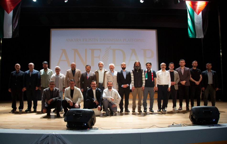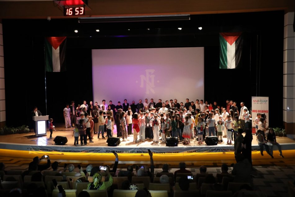 Programda Grup Nefer’in “Vuslat” adlı eseriyle yaptığı sahne performansı salonda büyük yankı uyandırdı. Öğrencilerin eşlik ettiği şarkılar, Gazze’ye duyulan ortak acının sesi oldu.