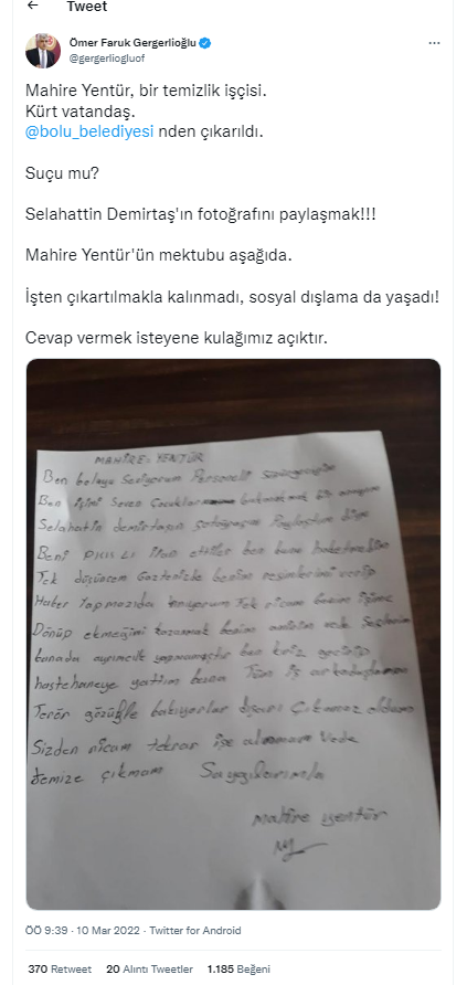 Twitter hesabından açıklamada bulunan Gergerlioğlu, Mahire Yentür, bir temizlik işçisi. Kürt vatandaş. Bolu Belediyesi'nden çıkarıldı. Suçu mu? Selahattin Demirtaş'ın fotoğrafını paylaşmak!!! Mahire Yentür'ün mektubu aşağıda. İşten çıkartılmakla kalınmadı, sosyal dışlama da yaşadı! Cevap vermek isteyene kulağımız açıktır” dedi.