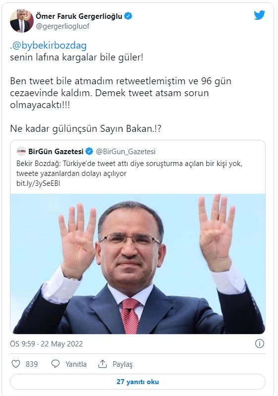 Bozdağ’ın katıldığı bir televizyon programında “Türkiye'de tweet attı diye hakkında soruşturma başlatılan bir kişi yok. Tweetin içinde yazandan dolayı soruşturma açılıyor” sözlerine attığı tweet ve retweet nedeniyle ceza verilen ve vekilliği düşürülen Gergerlioğlu’ndan yanıt geldi. Gergerlioğlu, Twitter hesabından Bozdağ’ı etiketleyerek, “Bekir Bozdağ senin lafına kargalar bile güler! Ben tweet bile atmadım retweetlemiştim ve 96 gün cezaevinde kaldım. Demek tweet atsam sorun olmayacaktı! Ne kadar gülünçsün Sayın Bakan?” dedi.