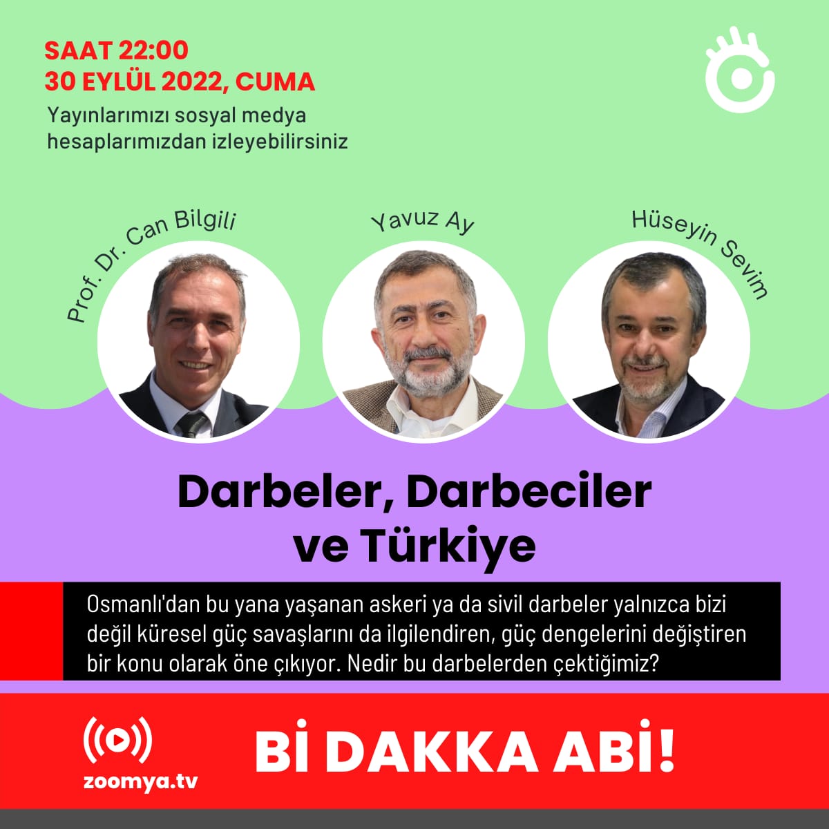 Sitemiz yayın kurulu başkanı ve yazarımız Mehmet Yavuz Ay ile diğer yazarımız Hüseyin Sevim, Prof. Dr. Can Bilgili’nin Zoomya TV’de hazırlayıp sunduğu “Bi Dakka Abi” programına katılarak "Darbeler, Darbeciler ve Türkiye"yi konuşacaklar.