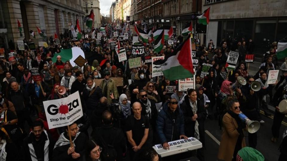 İsrail'in Filistin halkına karşı işlediği soykırım devam ettiği gerekçesiyle düzenlenen ulusal yürüyüşe katılan eylemciler, İngiliz hükümetinin İsrail'e silah satışlarına devam etmesine ve Gazze'de ateşkese rağmen İsrail saldırılarının sürmesine tepki gösterdi.