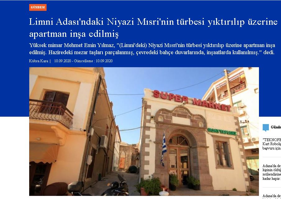 Zira muhtemelen Niyazi Mısri’nin beyitlerden haberdar olmuş olan Yunan meseleyi çok yanlış anlayarak (?), Limni Adasındaki Mısri Dergâhını
