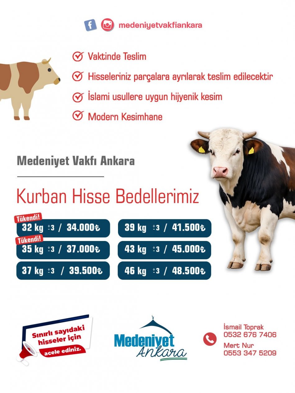 Kurban Hisseleri İçin İsmail Toprak: 0532 676 74 06 Mert Nur: 0553 347 52 09 no'lu telefonlarla irtibata geçebilirsiniz.