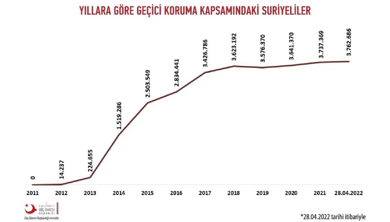 Bu tarihten 28 Nisan 2022 tarihine kadar geçen 11 yıllık süre zarfında, Göç İdaresi Başkanlığı'na göre aşağıda yer alan grafikte görüleceği üzere ne mülteci, ne sığınmacı ne de düzensiz göçmen olarak nitelendirilebilecek bu mazlumlar, iltica terminolojisindeki sıfatla belirtmek gerekirse "geçici koruma" statüsünde, Türkiye'de hayatiyetlerini sürdürüyorlar.
