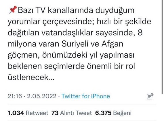 Suriyeli ve Afganlıların sekiz milyonu oy kullanacak denilip, seçimi bu savaş mağdurlarını ülkeye kabul eden iktidarın kazanacağı anlamını içeren zımni bir mesaj da verilmektedir. Oysa Türkiye'de vatandaşlık alıp oy kullanabilecek Suriyeli sayısı Göç İdaresi Başkanlığı'nın verilerine göre, 113 bin 654'dir.
