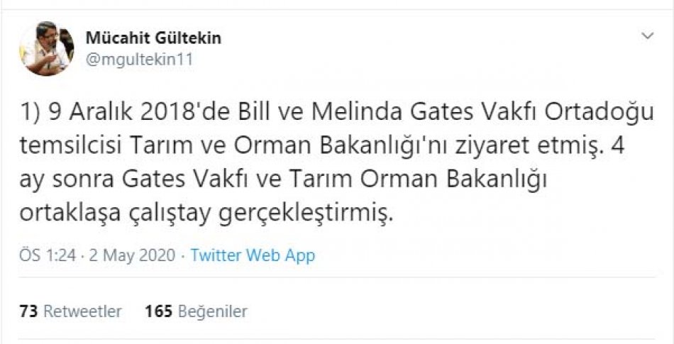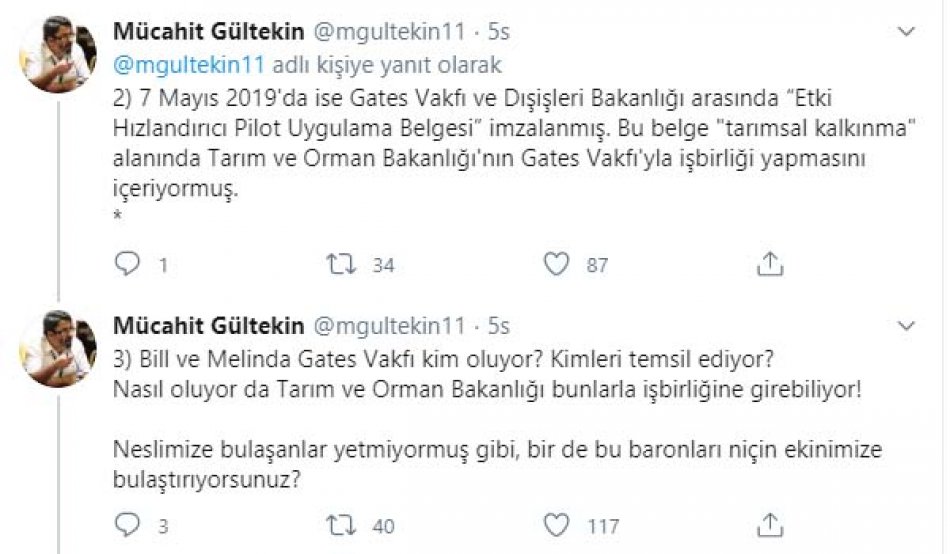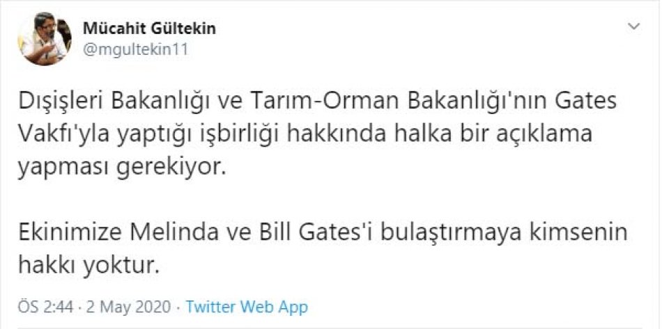 Gültekin, Tarım ve Orman Bakanlığının, koronavirüs salgınıyla birlikte ismi farklı iddialarla gündeme gelen Microsoft’un kurucusu ve dünyanın en zengin iş adamlarından olan Bill Gates’in başkanlığını yaptığı vakıfla ortak çalışmalar yürüttüğünü belirtti. Gültekin, yaptığı paylaşımda; “Bill ve Melinda Gates Vakfı kim oluyor? Kimleri temsil ediyor? Nasıl oluyor da Tarım ve Orman Bakanlığı bunlarla işbirliğine girebiliyor? Neslimize bulaşanlar yetmiyormuş gibi, bir de bu baronları niçin ekinimize bulaştırıyorsunuz?” tepkisinde bulundu.