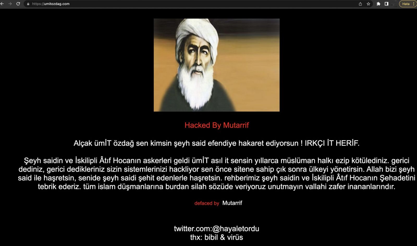 Mutarrif isimli grup sosyal medya hesabından Ümit Özdağ'ın resmi sitesini ve mail adresini hacklediklerini duyurdu: 'Şeyh Said'in, İskilipli Atıf Hoca'nın askerleri geldi.'