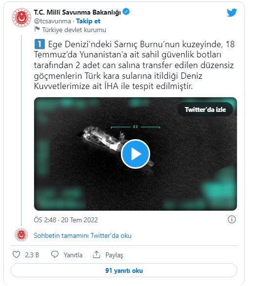 "Ege Denizi’ndeki Sarnıç Burnu’nun kuzeyinde, 18 Temmuz’da Yunanistan’a ait sahil güvenlik botları tarafından 2 adet can salına transfer edilen düzensiz göçmenlerin Türk kara sularına itildiği Deniz Kuvvetlerimize ait İHA ile tespit edilmiştir.