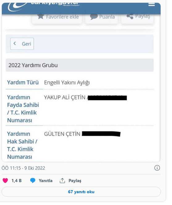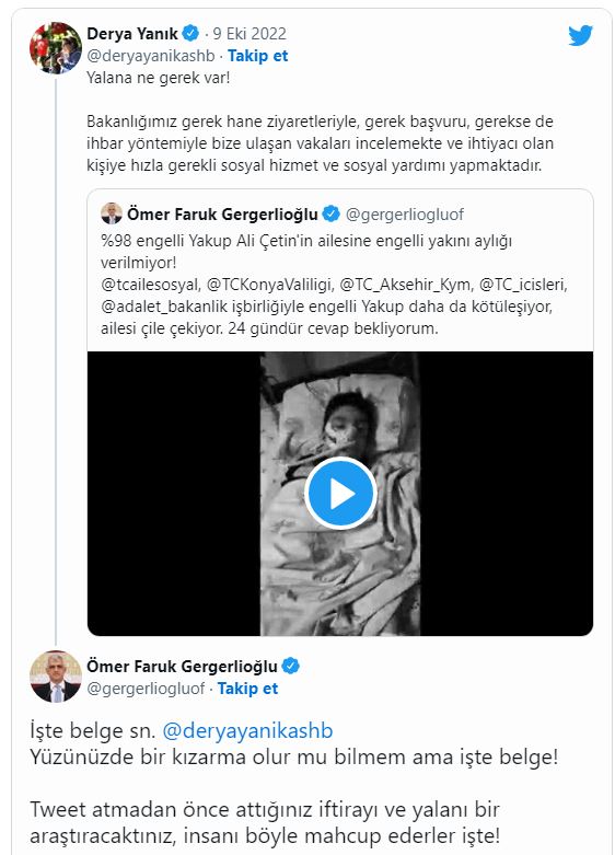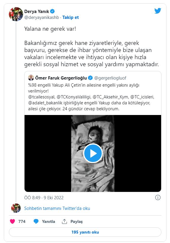 Aile ve Sosyal Hizmetler Bakanı Derya Yanık, bugün Gergerlioğlu’na yanıt verdi. Gergerlioğlu’nu ‘kara propaganda’ yapmakla suçlayan Yanık, Yakup Ali Çetin’in annesinin yaptığı başvuruya olumlu yanıt verildiğini belirterek şunları söyledi: “Yalana ne gerek var! Bakanlığımız gerek hane ziyaretleriyle, gerek başvuru, gerekse de ihbar yöntemiyle bize ulaşan vakaları incelemekte ve ihtiyacı olan kişiye hızla gerekli sosyal hizmet ve sosyal yardımı yapmaktadır. Yakup Ali Çetin’in annesi Sosyal Yardımlaşma ve Dayanışma vakıflarımıza 10.01.2022 tarihinde başvurmuş, 31.01.2022 tarihinde Evde Bakım Yardımı alması uygun görülmüştür. O günden bugüne evde yardım ödemeleri devam etmektedir. Siz de engelli vatandaşımız üzerinden kara propaganda yapacak kadar vicdanınızı kaybetmeyin! Kirli siyasi oyunlarınıza engellilerimizi alet etmeyin.”