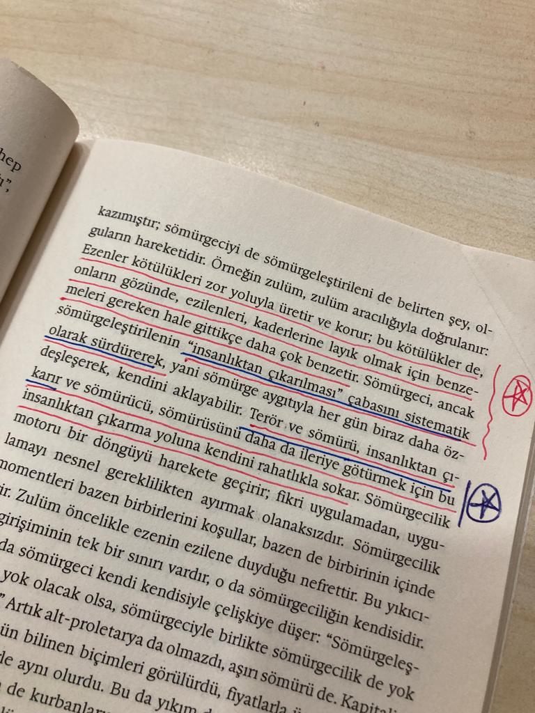 “Ezenler kötülükleri zor yoluyla üretir ve korur. Bu kötülükler de onların gözünde, ezilenleri kaderlerine layık olmak için benzemeleri gereken hale gittikçe daha çok benzetir. Sömürgeci, sömürgeleştirilenin insanlıktan çıkarılması çabasını sistematik olarak sürdürür.”sh.49.